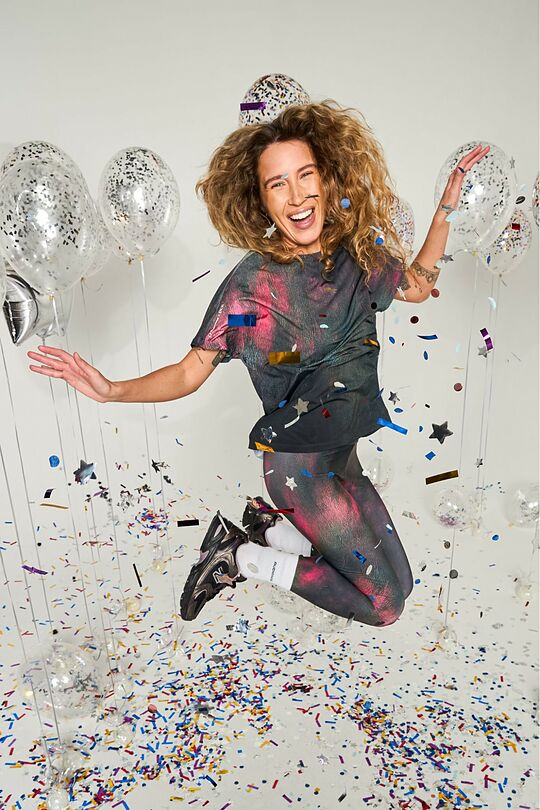 Rinkinį sudaro: sportiniai marginti marškinėliai Audimas x DUE. ir tamprės.