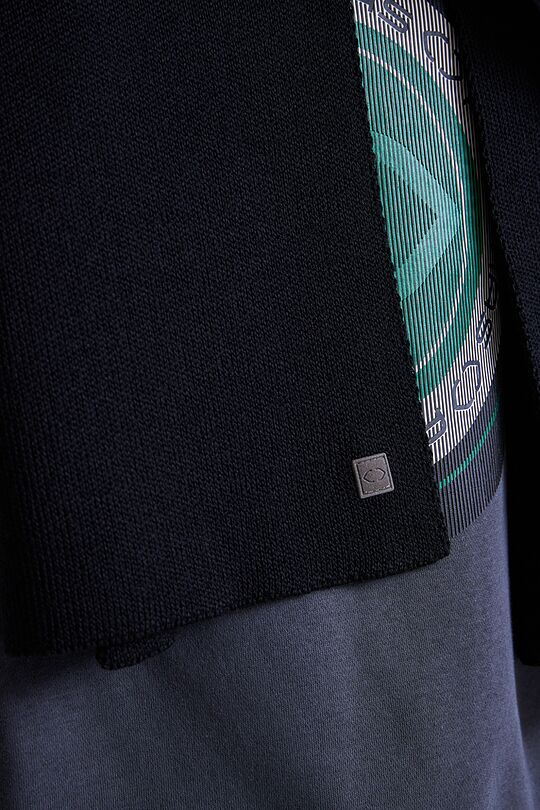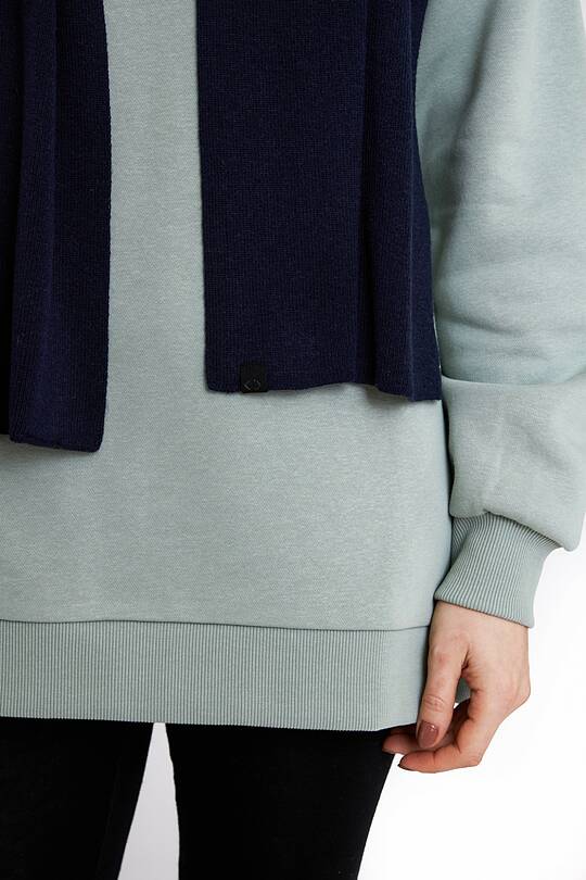 Megztas šalikas iš merino vilnos – vėsiam orui. Merino vilnos medžiaga šildo, yra lengva, maloni dėvėti, neerzina odos. Taip pat leidžia kūnui kvėpuoti, sugeria ir išgarina drėgmę, palaiko pastovią kūno temperatūrą bet kokiomis oro sąlygomis. Plona, bet patvari medžiaga atspari dėvėjimui, ilgai išlaiko savo funkcines savybes, nesiglamžo, neutralizuoja kvapus.