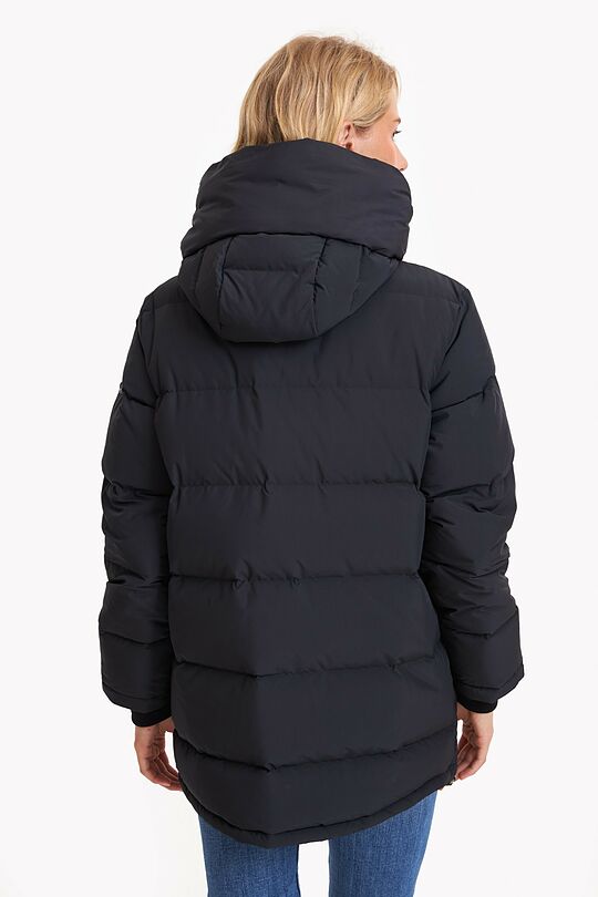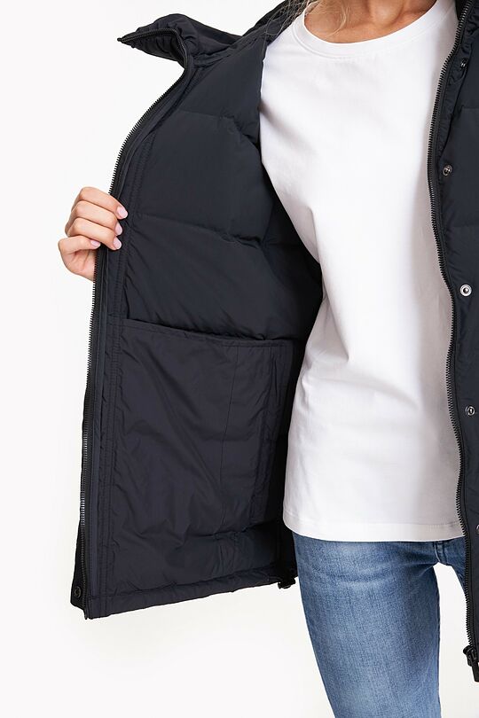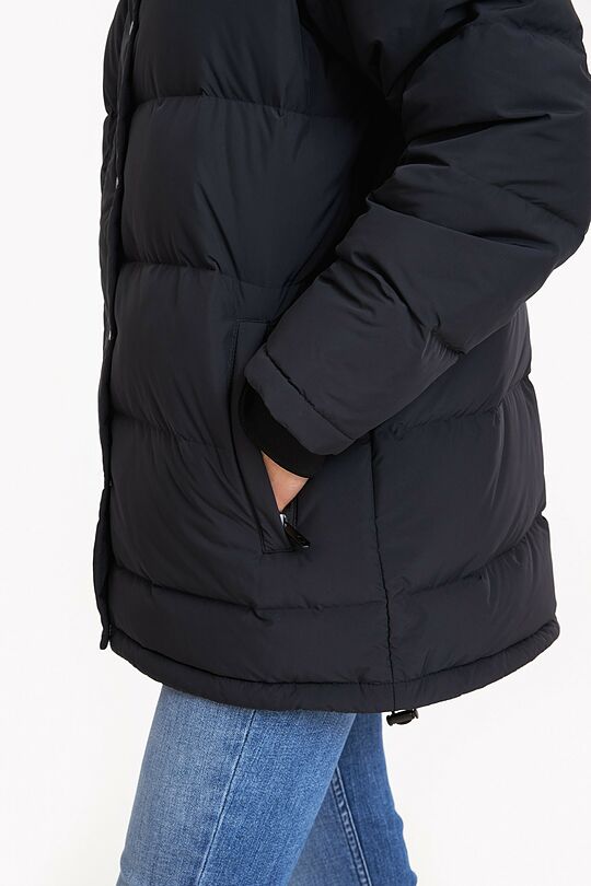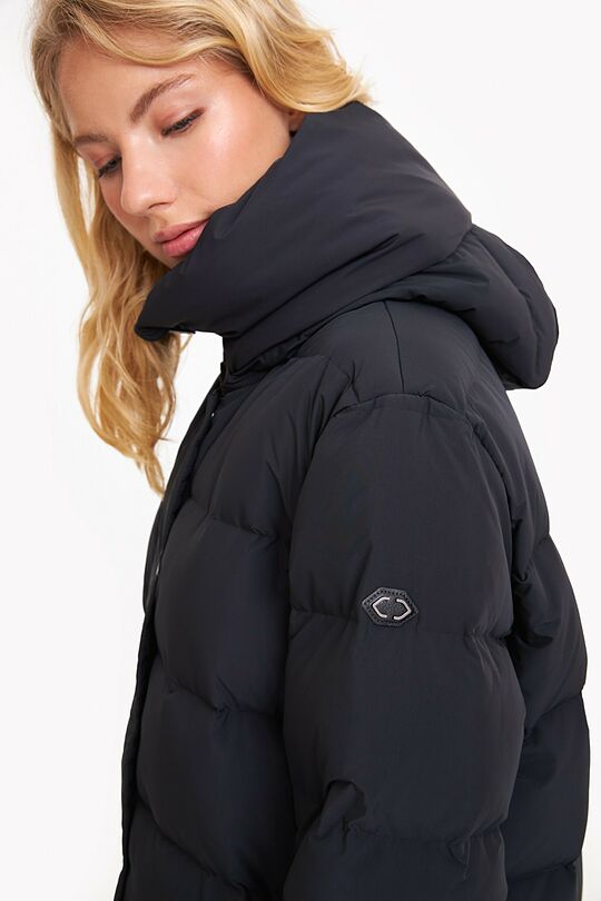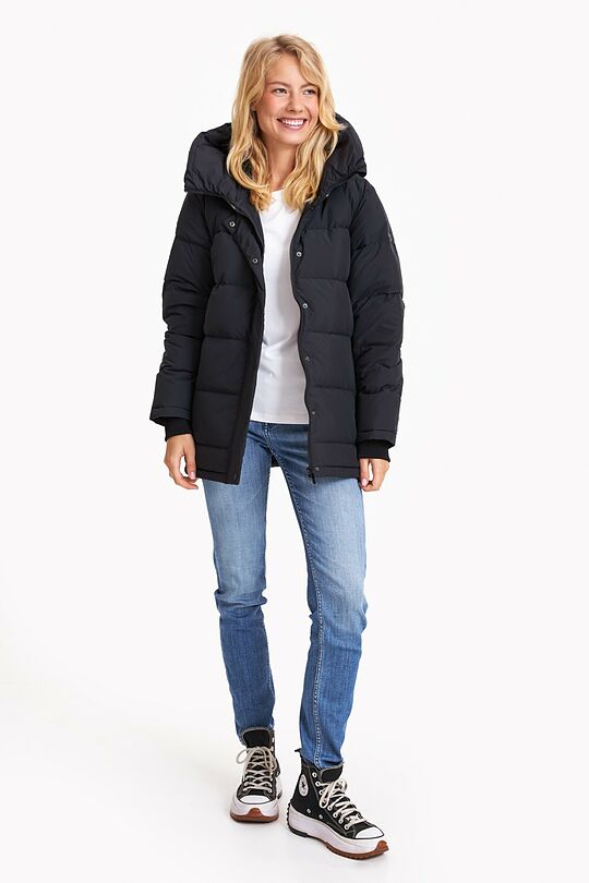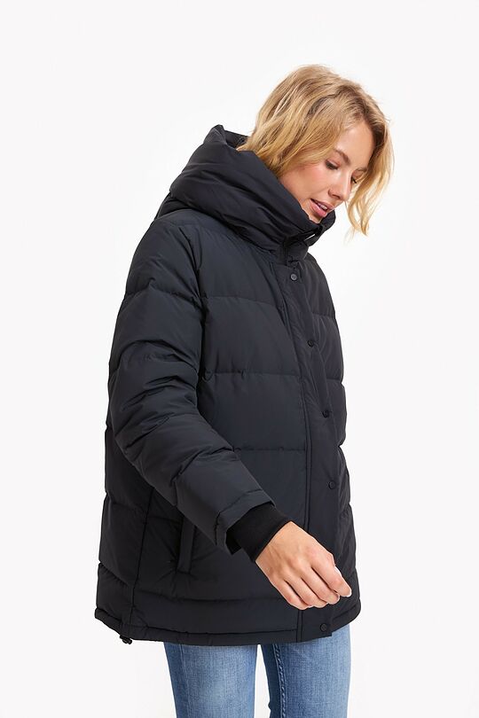 Laisvo silueto moteriška lengva pūkinė striukė puikiai tiks ir kasdienai, ir laisvalaikiui. Striukės konstrukcija – prailginta, drabužis su didele, minkšta apykakle ir gobtuvu. Gaminant striukę naudota besiūlė technologija, t. y. jos medžiaga ne peltakiuota, bet suausta. Suaustos siūlės stabdo pūkų migraciją į gaminio paviršių, todėl drabužis ilgai išlieka nepakitęs, šiltas.