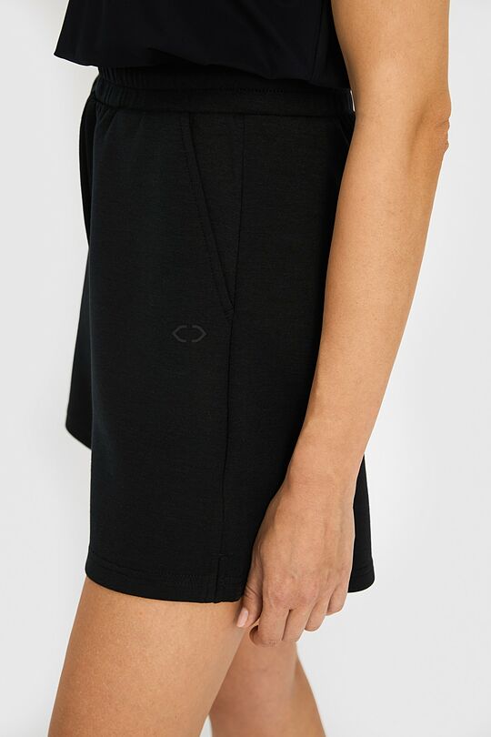 Šie laisvo silueto šortai išsiskiria unikalia medžiagos sudėtimi – poliesterio pluoštą papildo dirbtinis TENCEL™ pluoštas (lajocelis) ir elastanas, kurie suteikia švelnumo, elastingumo ir elegantiško kritimo pojūtį. Paaukštintas juosmuo, elastinė juosta ir reguliavimas virvele leidžia pritaikyti šortus individualiai. Skeltukai klešnių šonuose ir plati klešnė formuoja lengvą, moterišką siluetą. Šortai dekoruoti šalia kišenės išsiuvinėtu AUDIMAS logotipu.